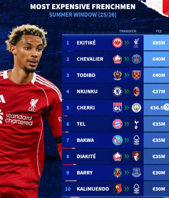 今夏法国球员转会费榜揭晓:埃基蒂克 9500 万欧元领跑